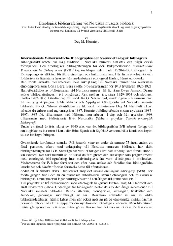 Etnologisk bibliografering vid Nordiska museets bibliotek: Kort historik om etnologisk ämnesbibliografering, något om etnologiämnets utveckling samt några synpunkter på urval och klassning till Svensk etnologisk bibliografi (SEB)