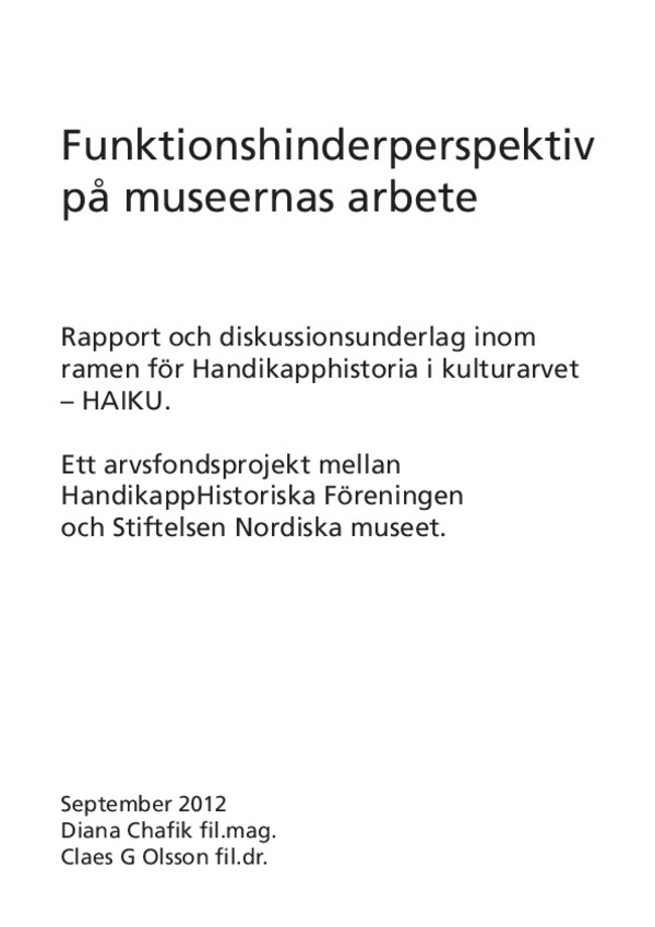 Funktionshinderperspektiv på museernas arbete: rapport och diskussionsunderlag inom ramen för Handikapphistoria i kulturarvet - HAIKU : ett arvsfondsprojekt mellan HandikappHistoriska Föreningen och Stiftelsen Nordiska museet